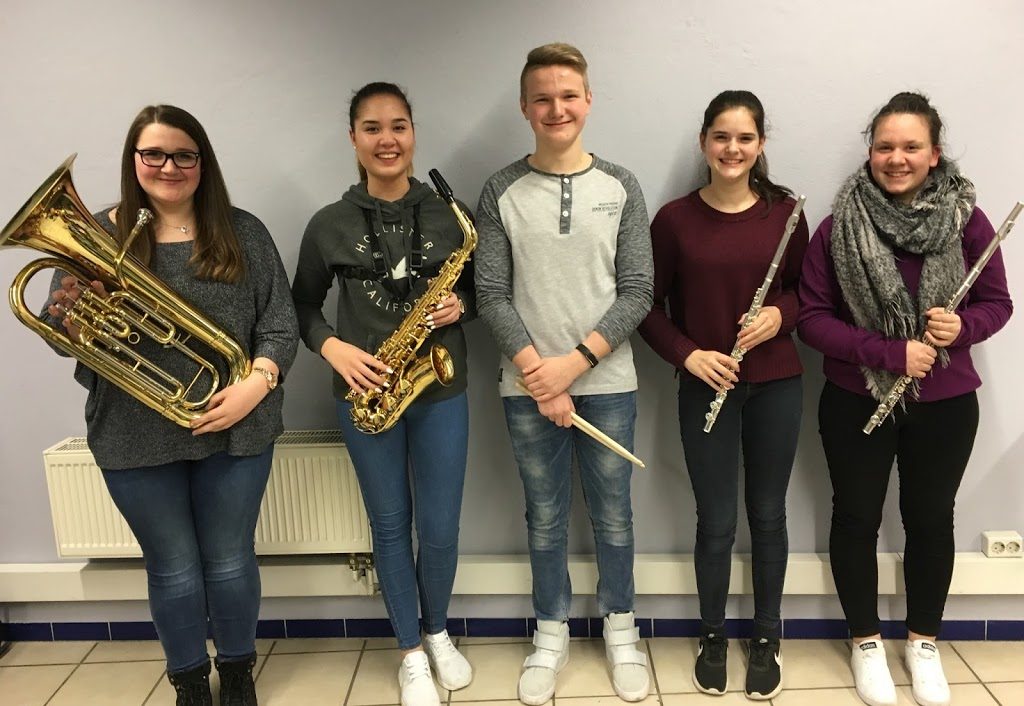 v.l.n.r.: Alisa Schüller (Euphonium), Temy Vogt (Saxophon), Lukas Oster (Schlagzeug), Nadine König (Querflöte) und Marie-Isabell Sczesny (Querflöte) |